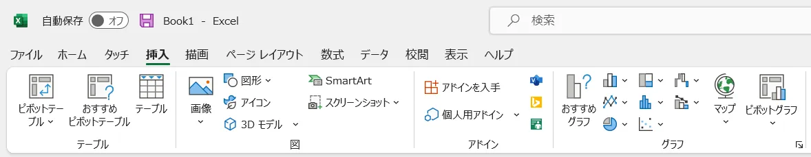 次に上部の[挿入]タブをクリックし,グラフを選択すると様々なグラフを作成することができます.