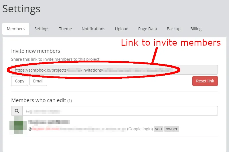 • Members: Allows you to add people to your project by sharing the link shown here.