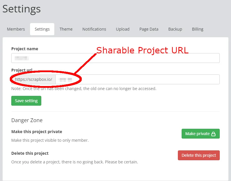 • Settings: Allows you to change the project link, public and private settings, and other project details.