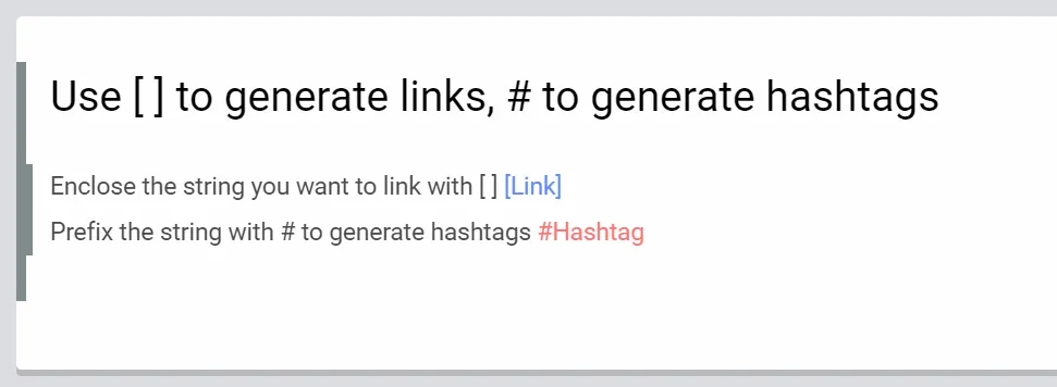 If you want to structure pages (relate pages to each other), you can use the link function or the hashtag function. You can automatically generate links by enclosing the string you want to link with [ ], and hashtags by prefixing the string with #.