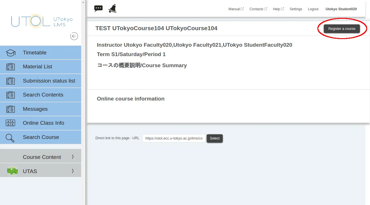 Even if you proceed with the “course registration” in UTOL, you will not be enrolled in the course. Therefore, if you need to enroll in a course, be sure to use UTAS (the academic affairs system) for enrollment registration.