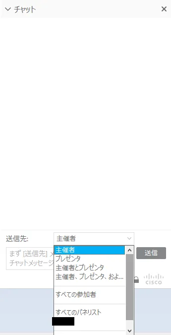 Chat panel allows all attendees to send messages. You can send a message to organizers or presenters by switching the email destiny.